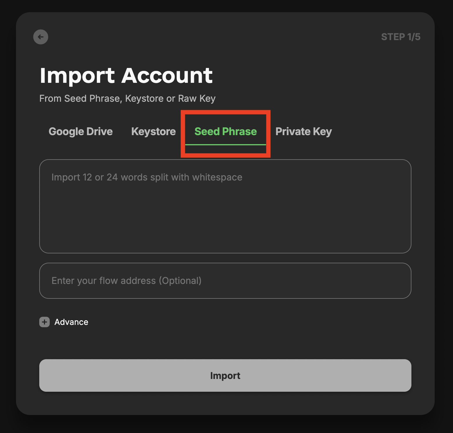 Once you have Flow Wallet Extension installed, open the extension and select to Import Wallet.